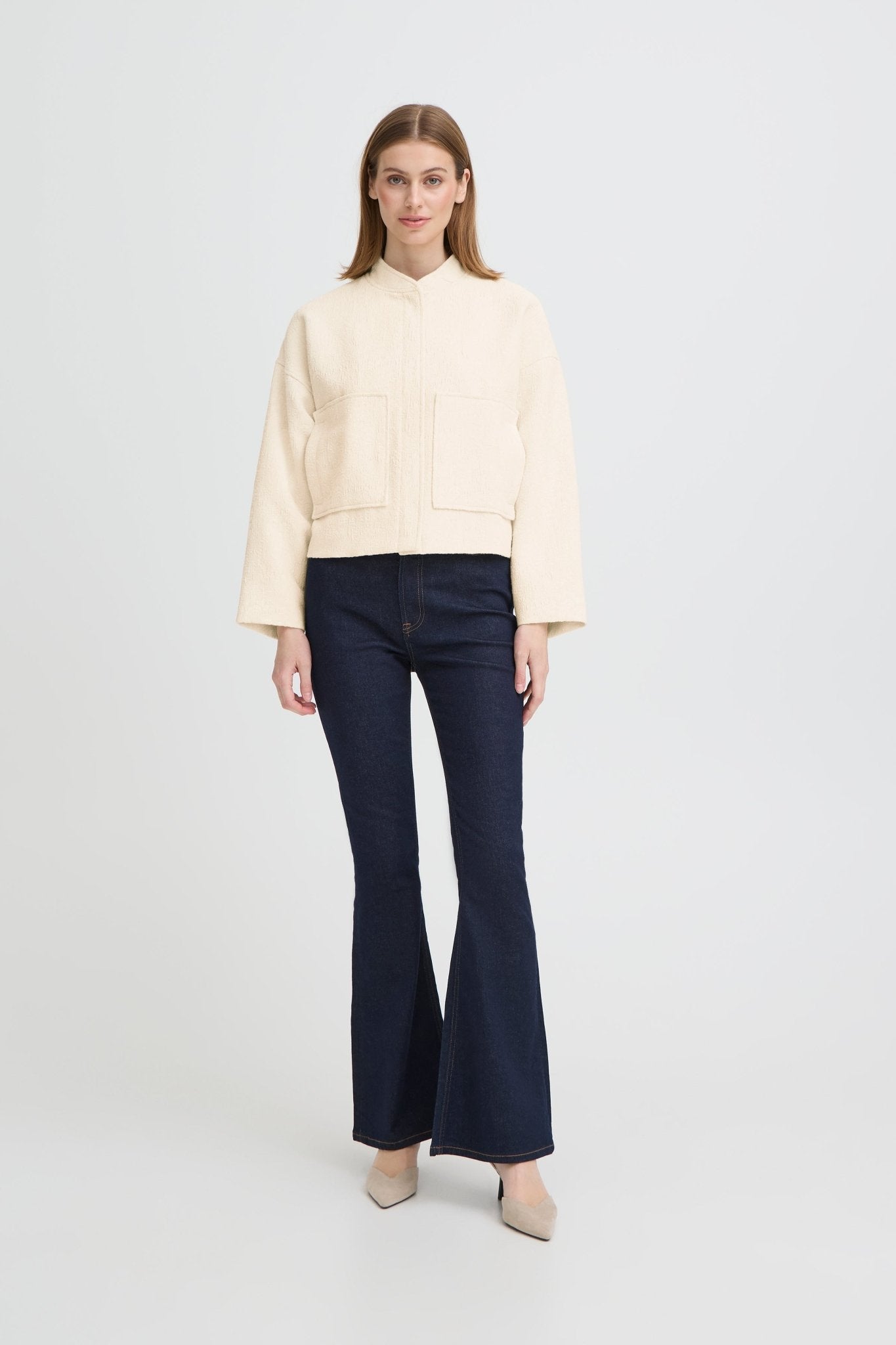 Diese Jacke in softem Cream wirkt ruhig, klar und sofort angezogen. Der gerade Regular Fit mit verkürzter, gerader Silhouette lässt dir Bewegungsfreiheit und passt besonders schön zu Denim oder cleanen Stoffhosen. Der Stehkragen und die verdeckte Front sorgen für eine elegante Linie, während die großen aufgesetzten Taschen dem Look eine moderne Lässigkeit geben. Dezente Handschrift von ICHI für Tage, an denen du es leicht und gepflegt magst. Material: 56% Polyester, 44% Acryl