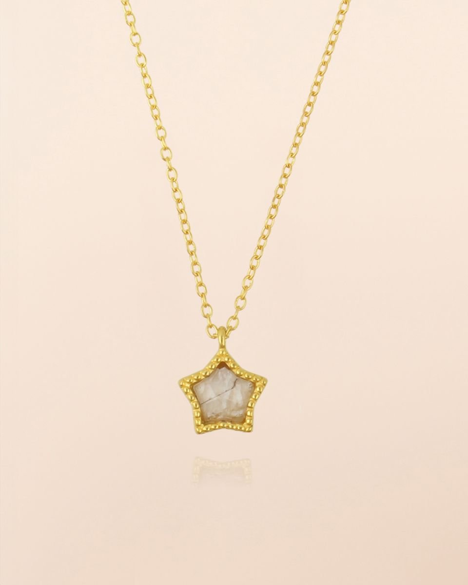 Diese filigrane Halskette zeigt einen kleinen Stern, der ruhig im Mittelpunkt liegt. Der white moonstone wirkt weich und leicht transluzent, eingefasst in einen goldfarbenen Rahmen mit feiner Struktur. Entworfen von Muja Juma, verbindet das Schmuckstück klare Form mit einer stillen, fast schwebenden Präsenz. Material: Sterling Silber gold plated