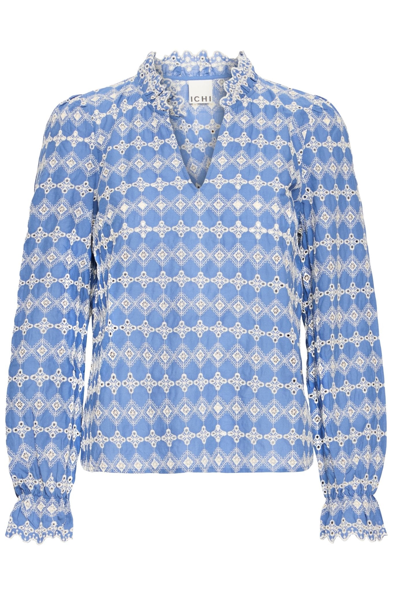 Diese gemusterte Bluse wirkt lebendig und zugleich ruhig. Das grafische Muster in Blau und Weiß bringt Tiefe in den Look, ohne aufdringlich zu sein, und verleiht der Oberfläche eine fein strukturierte Optik. Der V Ausschnitt mit zarter Spitzenkante öffnet den Halsbereich weich und sorgt für eine feminine Linie, während die Ärmel locker fallen und Bewegung in das Design bringen. Der Stoff fühlt sich angenehm leicht an und begleitet Dich mühelos durch den Tag. Entworfen von ICHI. Material: 100% Cotton.