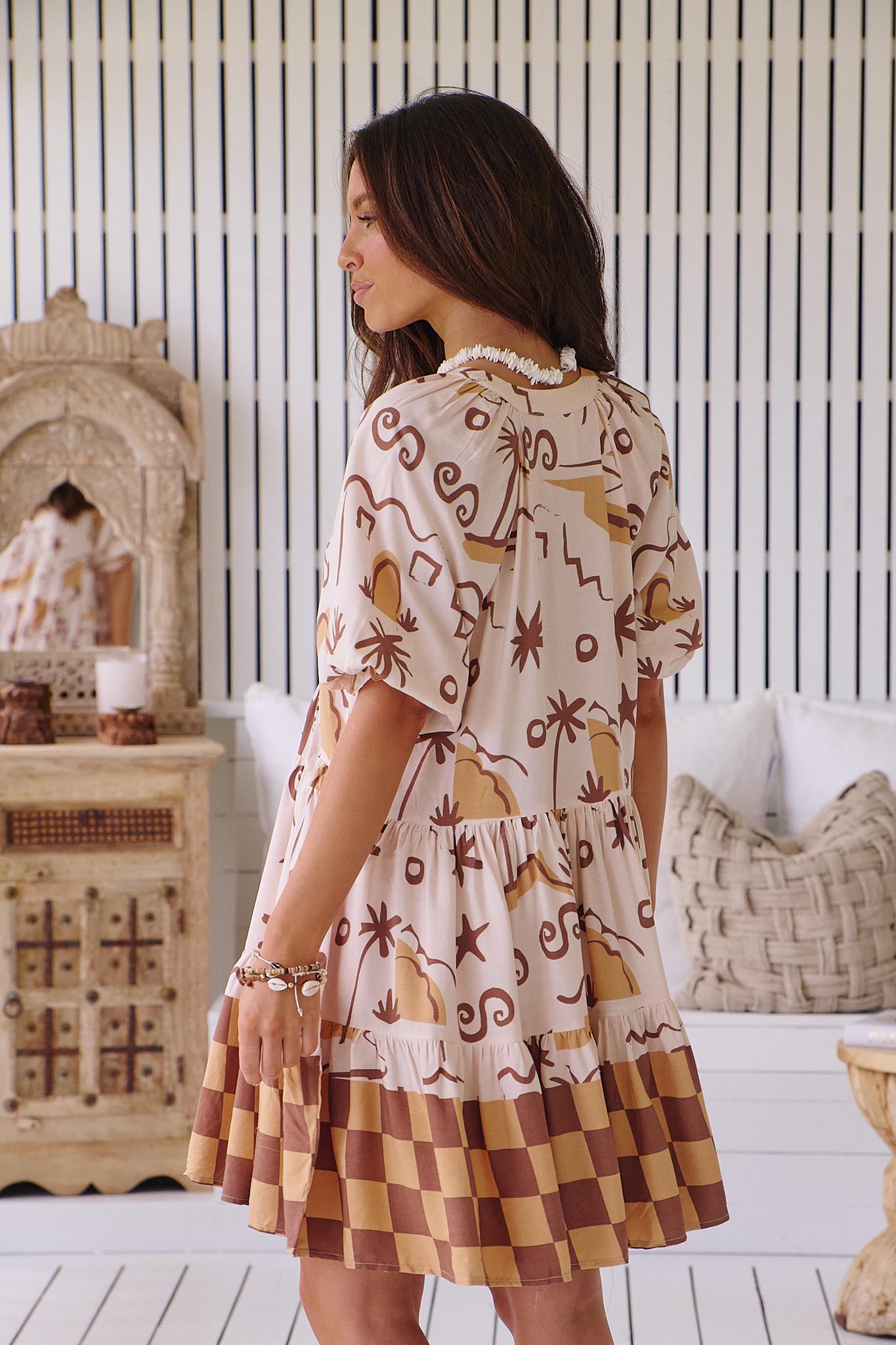 Auf einen Blick: Kurzes Stufenkleid mit locker fallender Silhouette, V-Ausschnitt, 3/4-Ärmel, grafisch-natürliches Muster in Creme- und Brauntönen; geeignet für Alltag, Office und festliche Abende in Herbst/Winter.