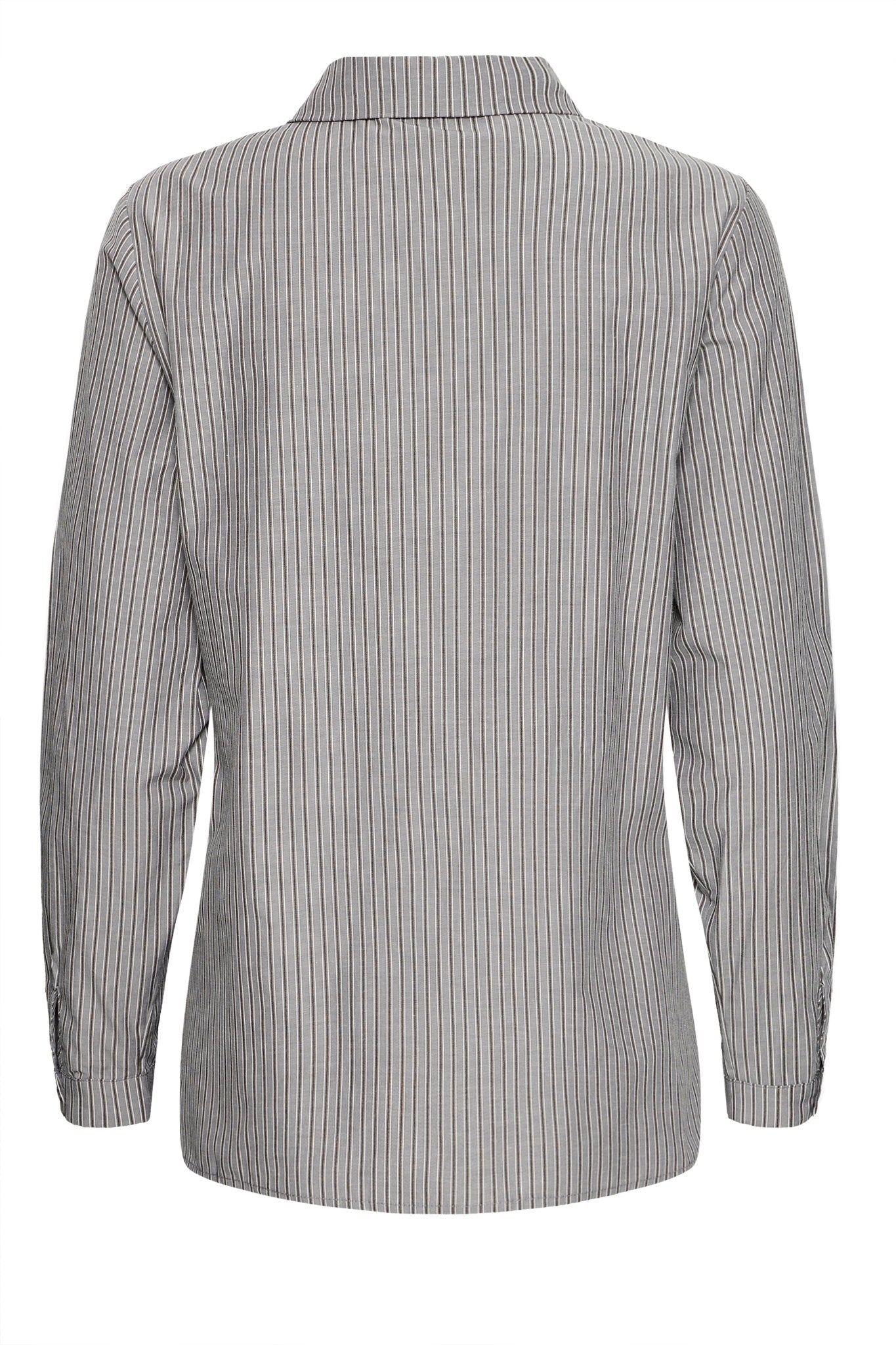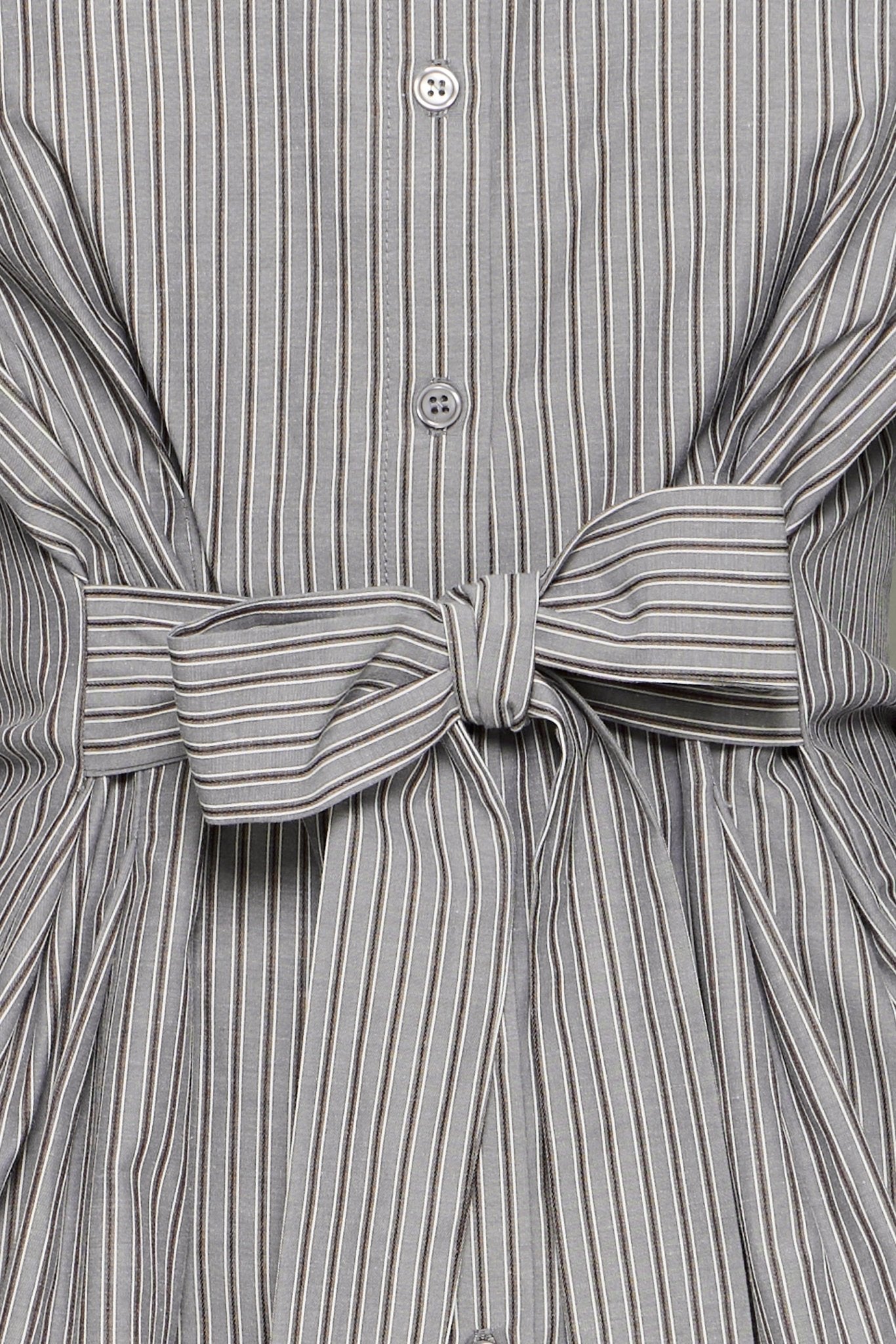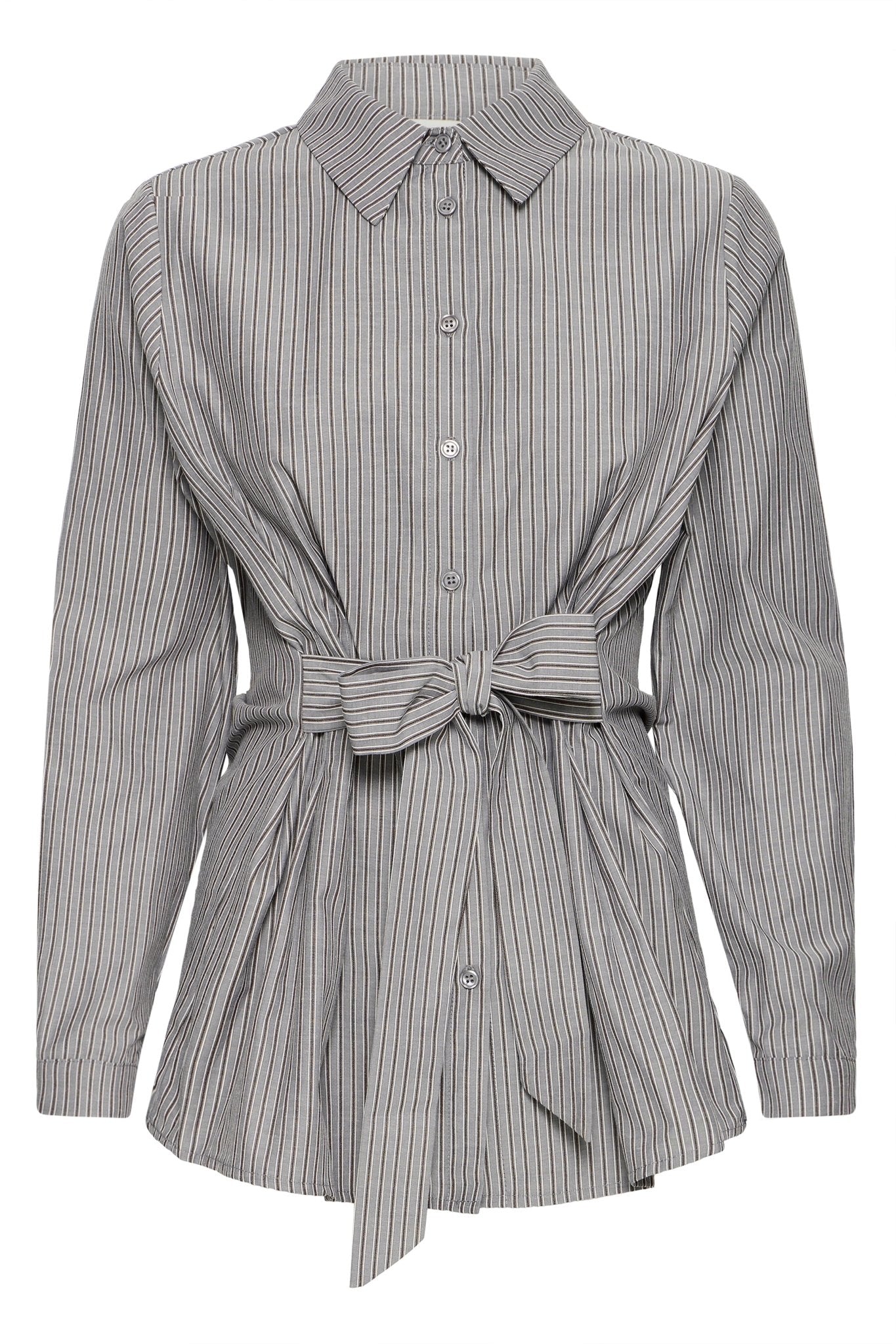 Auf einen Blick: Gestreifte Bluse in Grau • lange Ärmel • taillierter Schnitt mit Bindegürtel • Knopfleiste • Herbst/Winter