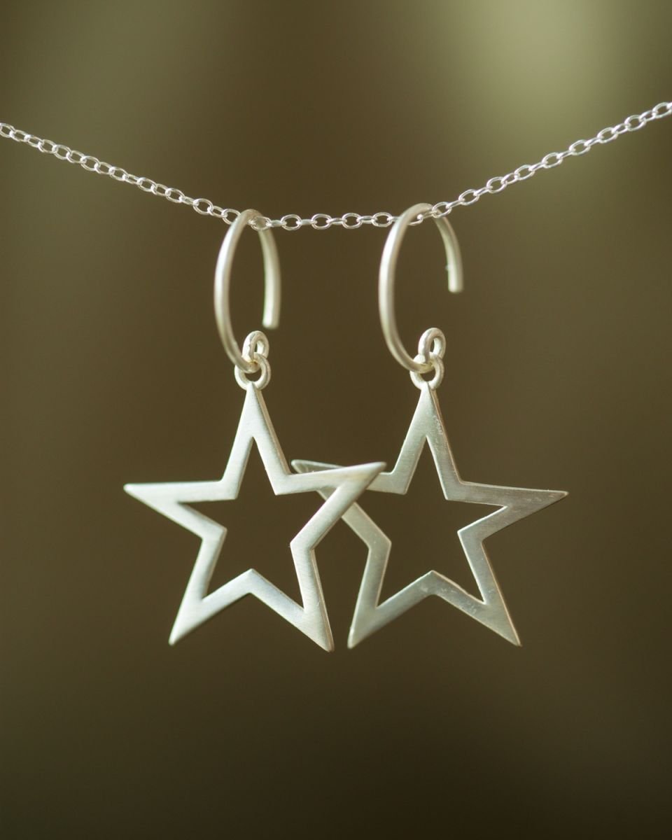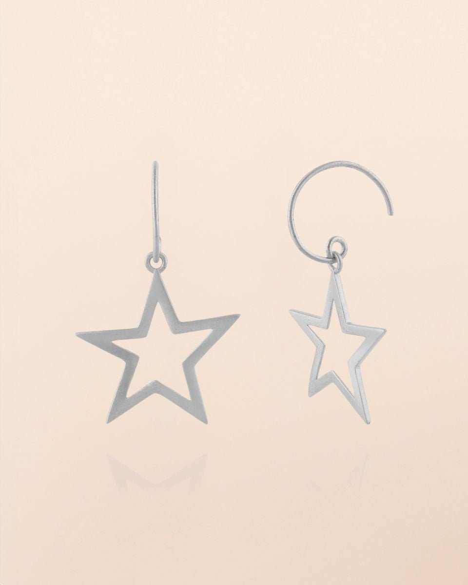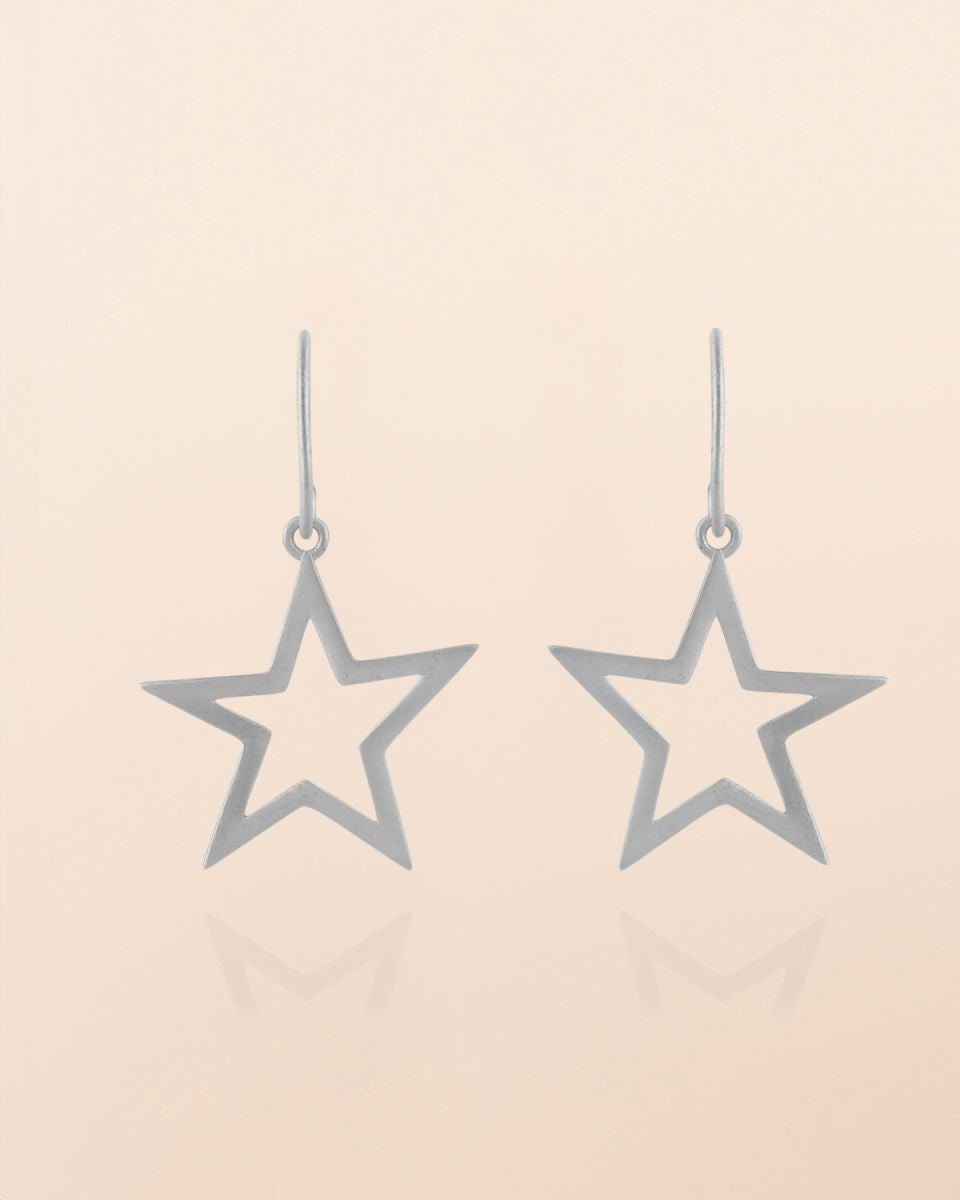 Auf einen Blick: hängende Ohrringe, offene Sternform, matter Silberton, klare geometrische Linien.