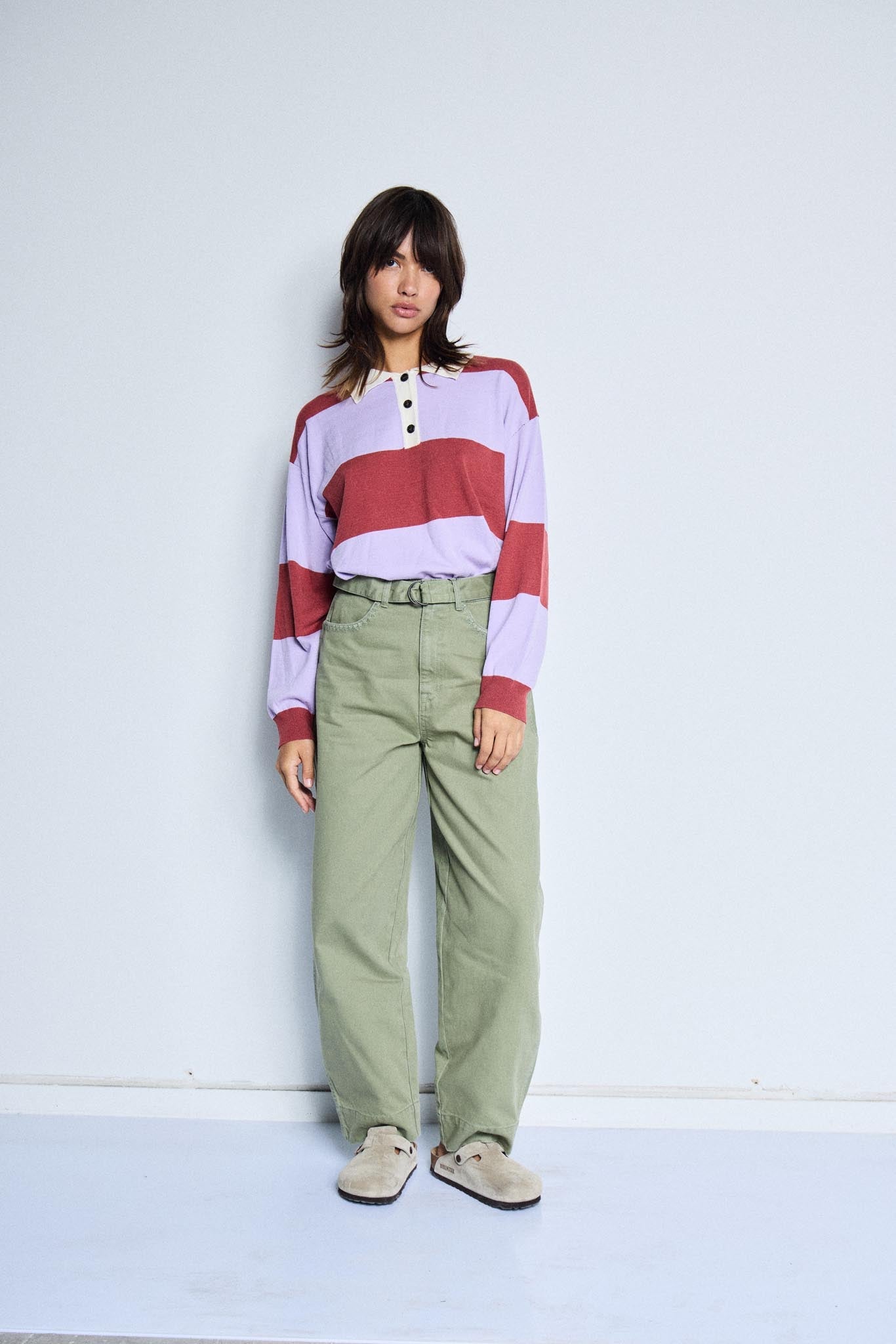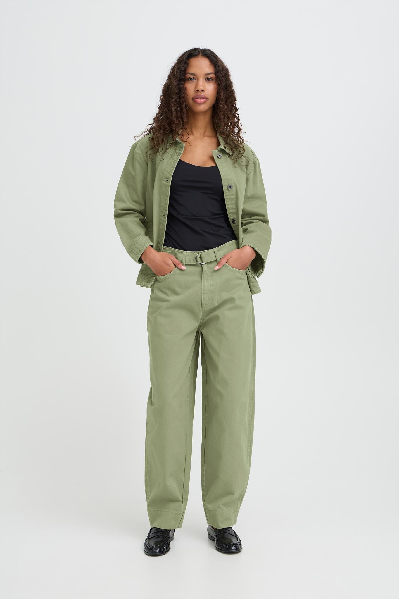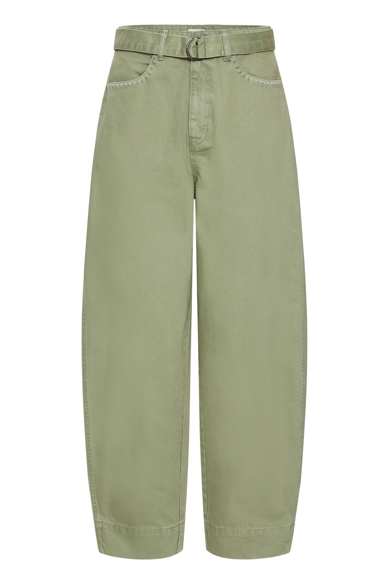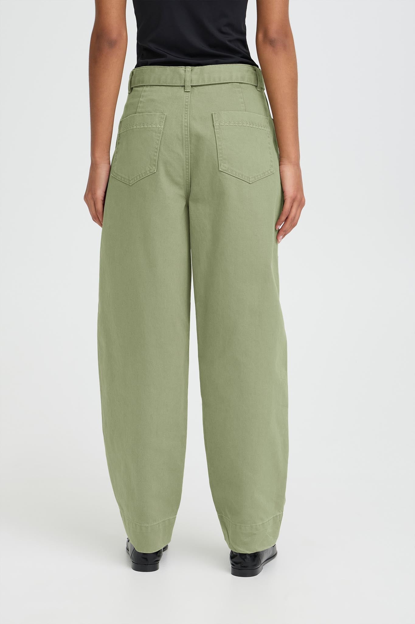 Diese Hose wirkt klar, modern und angenehm unaufgeregt. Der weite Beinverlauf fällt locker und bringt Bewegung in die Silhouette, während die reguläre Taillenhöhe für einen ausgewogenen Sitz sorgt. Der Ton in sanftem Grün wirkt natürlich und lässt sich vielseitig kombinieren. Feine Ziernähte an den Taschen und der schmale Gürtel mit Metallschließe setzen dezente Akzente, ohne die Ruhe des Designs zu stören. Entworfen von ICHI. Material: 100% Cotton.