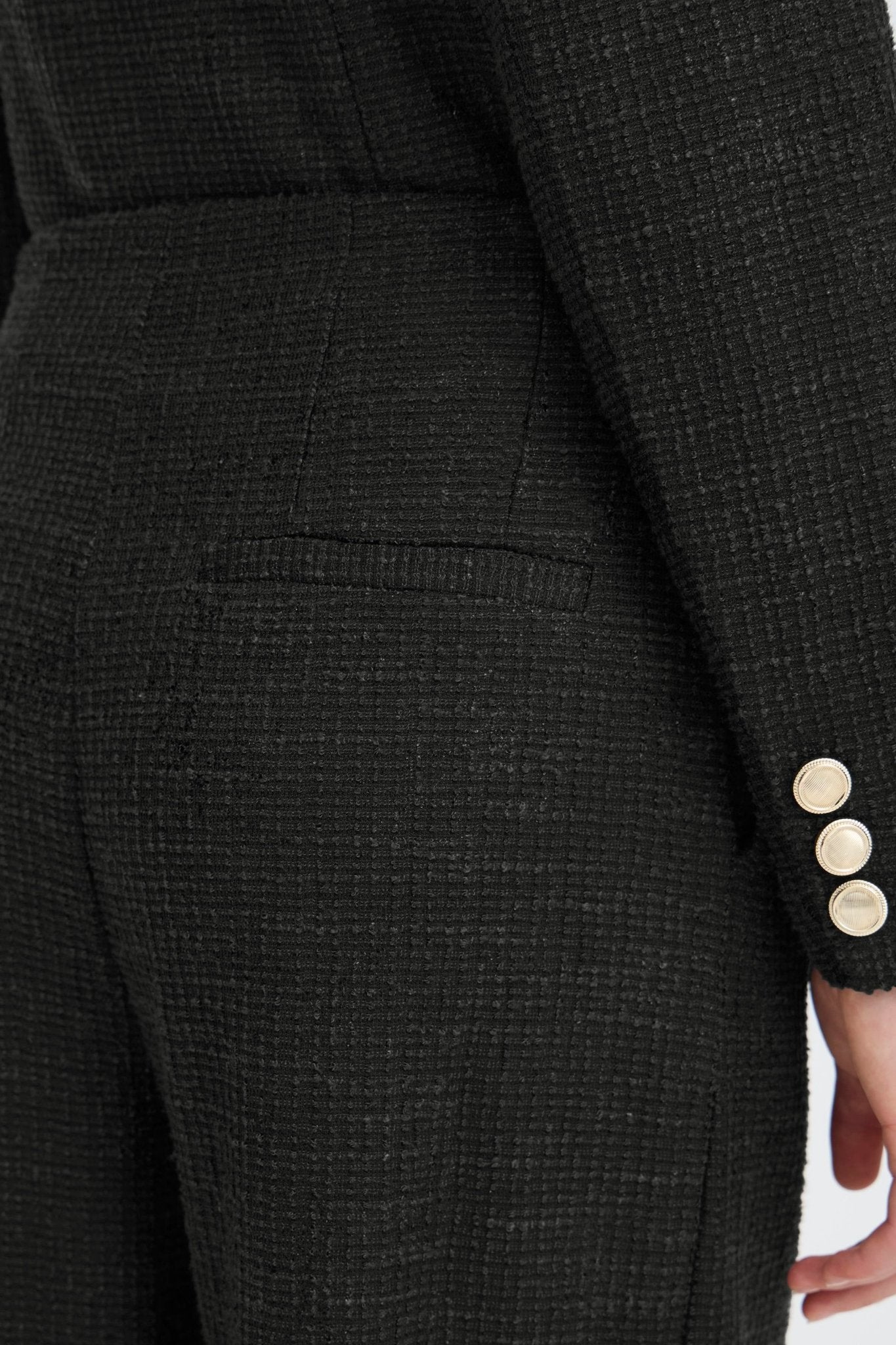 Diese elegante High-Waist-Hose von ICHI überzeugt durch ihren modernen Schnitt und ihre edle Textur. Das weite Bein fällt weich und verleiht jeder Bewegung eine ruhige Eleganz. Die leicht strukturierte Oberfläche sorgt für Tiefe und Raffinesse – perfekt für stilvolle Office-Looks oder abendliche Anlässe. Material: 77 % Polyester, 22 % Viskose, 1 % Elasthan.