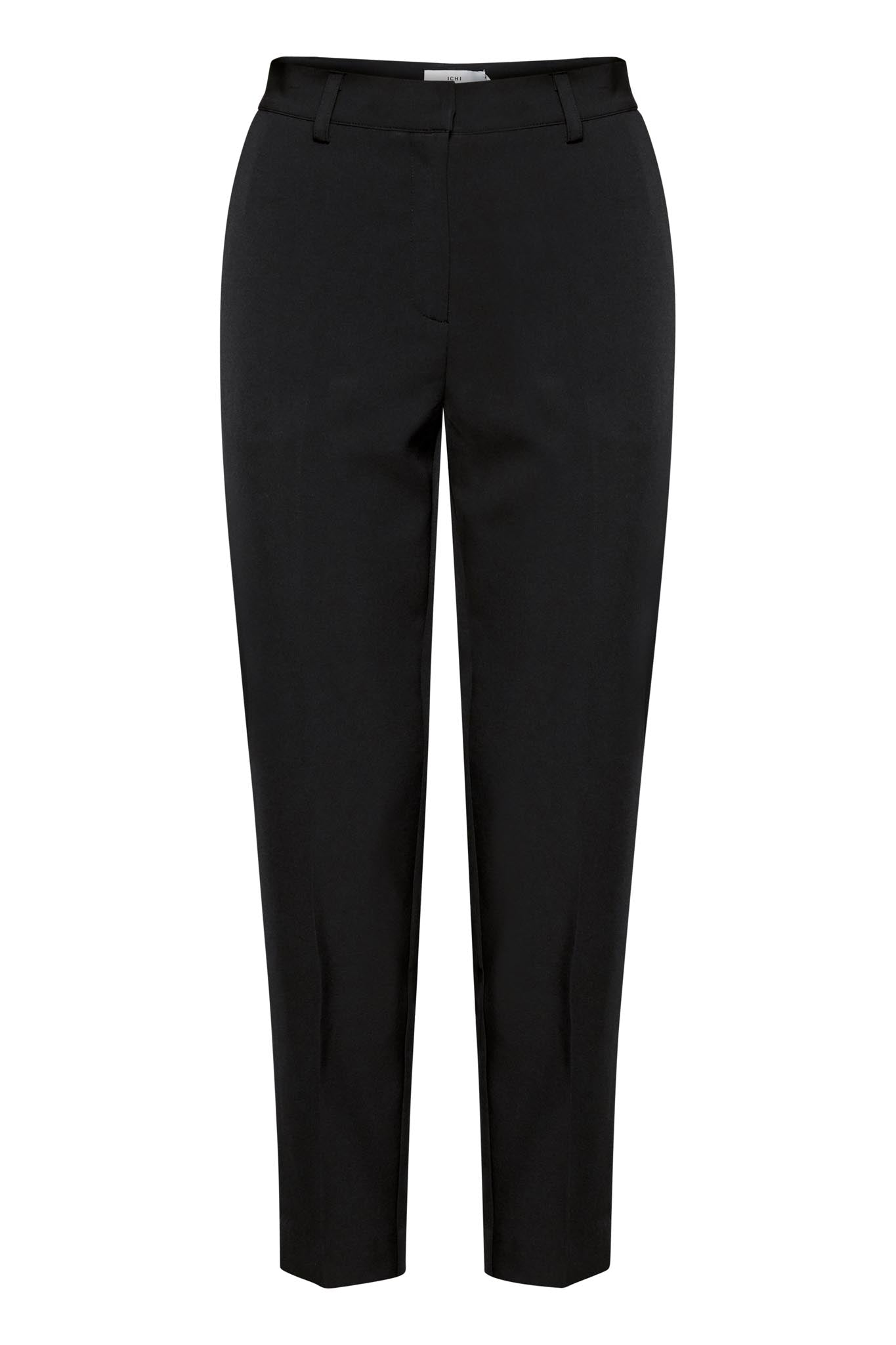 Die schwarze Stoffhose von ICHI zeigt eine ruhige, klare Linie, die sofort ein Gefühl von Ordnung und Leichtigkeit vermittelt. Die Passform ist sanft anliegend, ohne einzuengen, und der gerade Fall wirkt angenehm harmonisch. Die Oberfläche wirkt glatt und weich, was dem Look eine elegante Zurückhaltung schenkt. Material: 90% Polyester, 10% Elastane