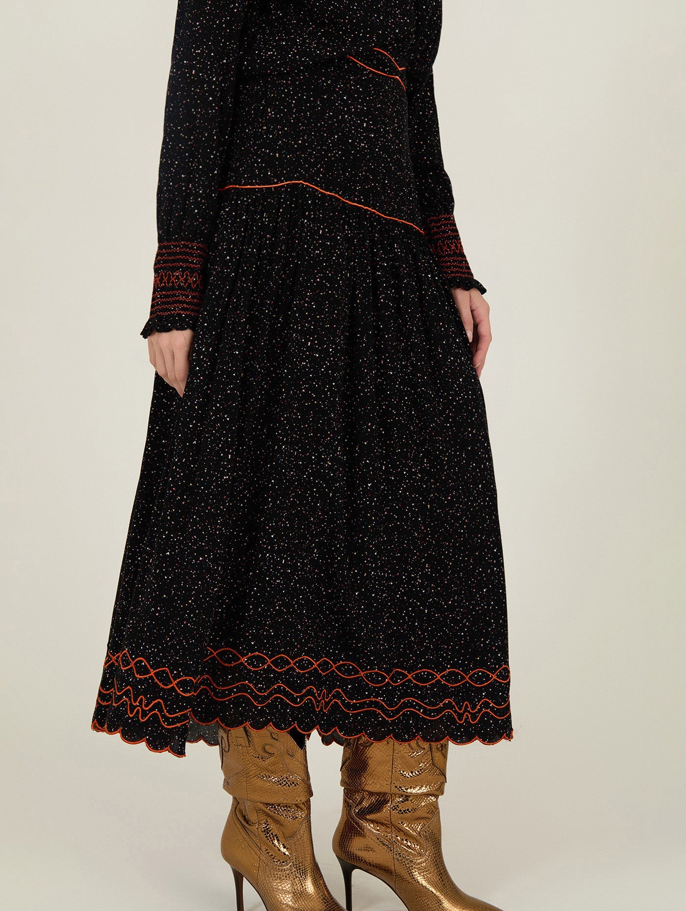 Auf einen Blick: Midirock • Schwarzer Grundton mit dezentem Print • Zierstickerei in Rot • Ausgestellte Silhouette • Saison Herbst/Winter