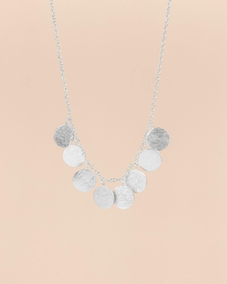 Auf einen Blick: Halskette im Silberton, feine Gliederkette, mehrere runde Coin Anhänger mit matter, leicht strukturierter Oberfläche, ohne Stein.