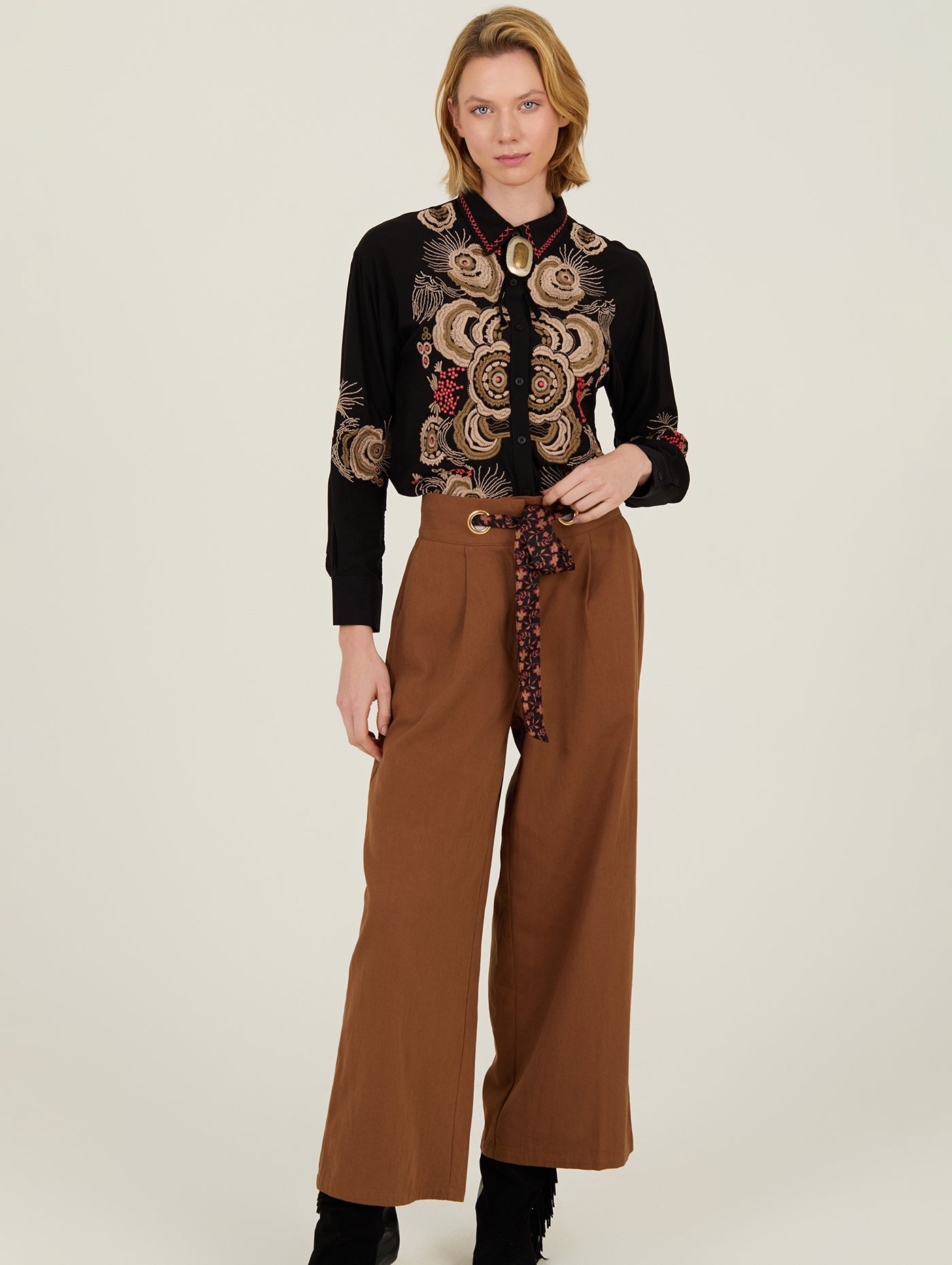 Diese Hose kombiniert klare Linien mit einem verspielten Detail: Der Bindegürtel im floralen Muster hebt sich elegant von der warmen Braunnuance ab und wird durch die goldfarbenen Ösen stilvoll akzentuiert. Die weite Passform schenkt dir Bewegungsfreiheit und eine moderne Silhouette. Aus 100% Baumwolle gefertigt, trägt sie sich angenehm auf der Haut. Dezent von MEISIE entworfen, ist sie ein vielseitiges Piece für die kalte Jahreszeit.